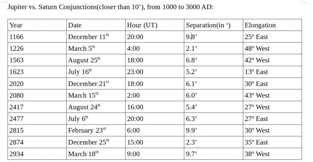 Can Jupiter ever occult Saturn? Well, we looked at 20,000 years worth of conjunctions (it's what we do for fun) and found 58 close (less than 10' apart) conjunctions of Jupiter and Saturn over 200 centuries, with only 11 in the 2000 year span from 1000 AD to 3000 AD... but only 5 that are closer than the conjunction in 2020.