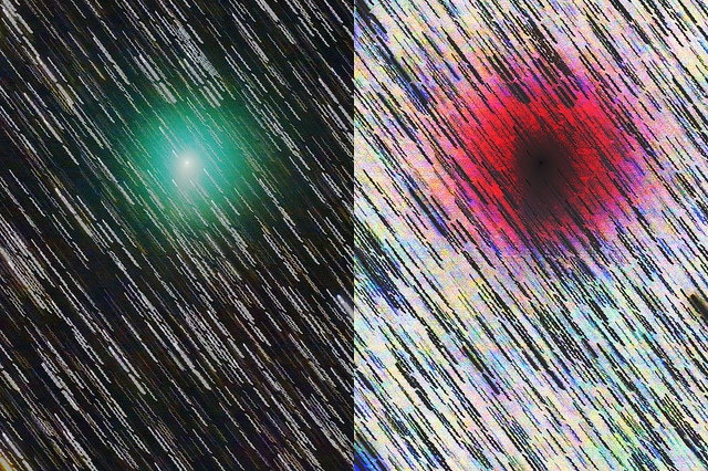 Comet 41P Tuttle-Giacobini-Kresák glows green (left) and shows its true coma and just the hint of a stubby tail in the negative (red) image (right) from March 19th. Image