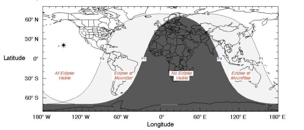 The eclipse is visible in its entirety from North America, while South America sees the eclipse in progress at sunrise/moonset, and eastern Asia and Australia sees the eclipse underway at sunset/moonrise. Hawaii gets the very best view, with the eclipsed Moon very near the zenith.