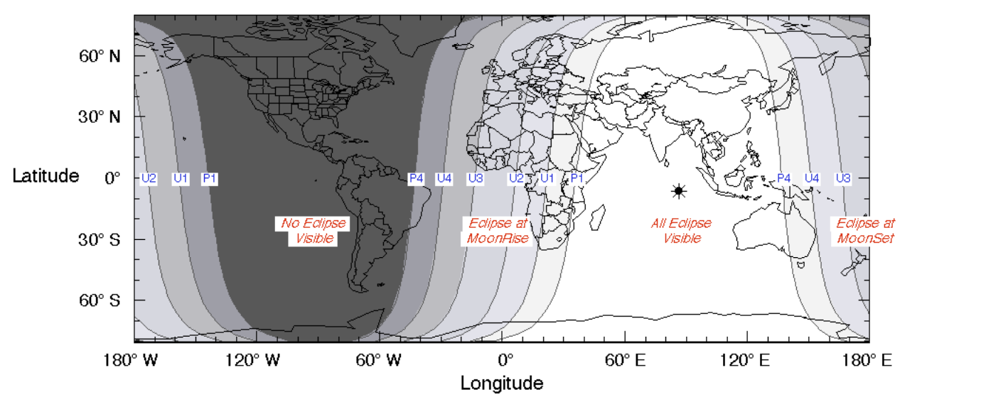 The eclipse favors the Indian Ocean region in its entirety. Europe sees the eclipse already underway at moonrise, while Australia catches it in progress at moonset. Only the Americas sit this one out. The Indian Ocean and surrounding regions will see the eclipse transpire high in the sky, while the regions that catch it at dawn or dusk will have an opportunity to nab the photogenic eclipsed Moon along with foreground objects. Think architecture, monuments, hills, etc.