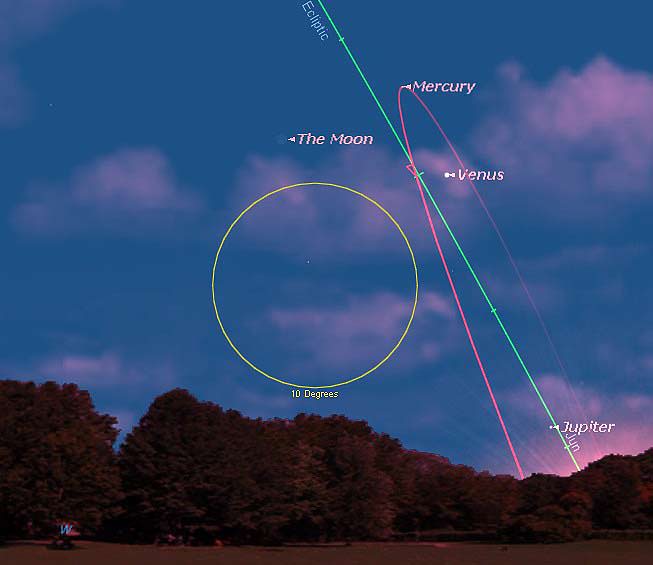 finds a 4% illuminated Moon passing just over 5 degrees (about 10 Full Moon diameters) south of Venus and Mercury. Venus will be the first to appear as the sky darkens, shining at magnitude -3.9 and Mercury will shine about 40 times fainter above it at magnitude +0.3.