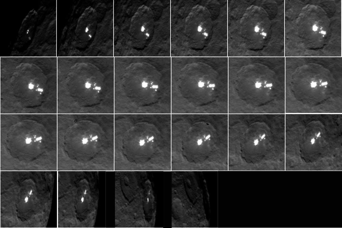 This animation shows a sequence of images taken by NASA's Dawn spacecraft on May 4, 2015, from a distance of 8,400 miles (13,600 km), in its RC3 or science mapping orbit. The image resolution is 0.8 mile (1.3 km) per pixel. Credit: NASA/JPL-Caltech/UCLA/MPS/DLR/IDA[/caption]