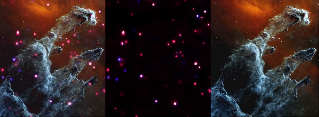 The Chandra data reveals young, massive stars that recently formed, which appear as pink and purple dots because of their powerful X-ray emissions. In the combined image, these young stars look like fireflies flitting around the sky in front of a setting sun, the Pillars appearing as billowing clouds.