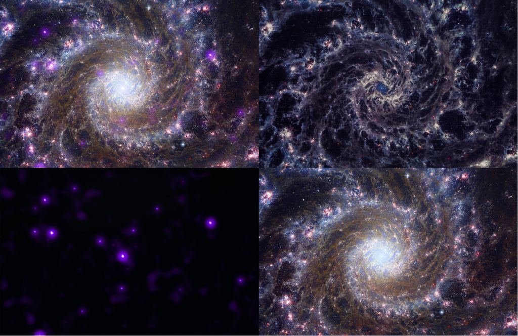 Hubble optical data already manages to highlight the galaxy's spiral arms, its bright core, the distribution of stars (purple, white, and orange, corresponding to their size and age), and the dust lanes and gas clouds throughout. Still, the Webb data outlines the gas and dust, which appear as silvery-blue arms in infrared wavelengths. This reveals the swirling web-like structure within the spiral arms, while Chandra's X-ray data highlights the high-energy activity from particularly young and massive stars.