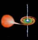 "This poses a puzzle. The simple model for jets doesn't explain what we are seeing," said Philip Kaaret of the Harvard-Smithsonian Center for Astrophysics in Cambridge, Mass., and lead author of another upcoming Astrophysical Journal paper on XTE J1550-564. "Either the black hole may somehow be feeding more energy into the western jet, or that jet has run into a dense cloud."