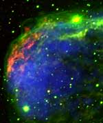 Massive stars lead short, spectacular lives. This composite X-ray(blue)/optical (red and green) image reveals dramatic details of a portion of the Crescent Nebula, a giant gaseous shell created by powerful winds blowing from the massive star HD 192163 (a.k.a. WR 136).