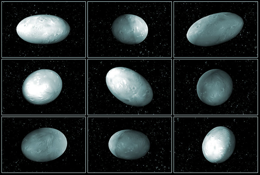 As the duo dances an orbital duet about their common center of gravity, their variable gravitational field sends the smaller moons tumbling erratically. The effect is enhanced even more by their irregular and elongated shapes. It's likely Pluto's other two moons, Kerberos and Styx, are in a similar situation.