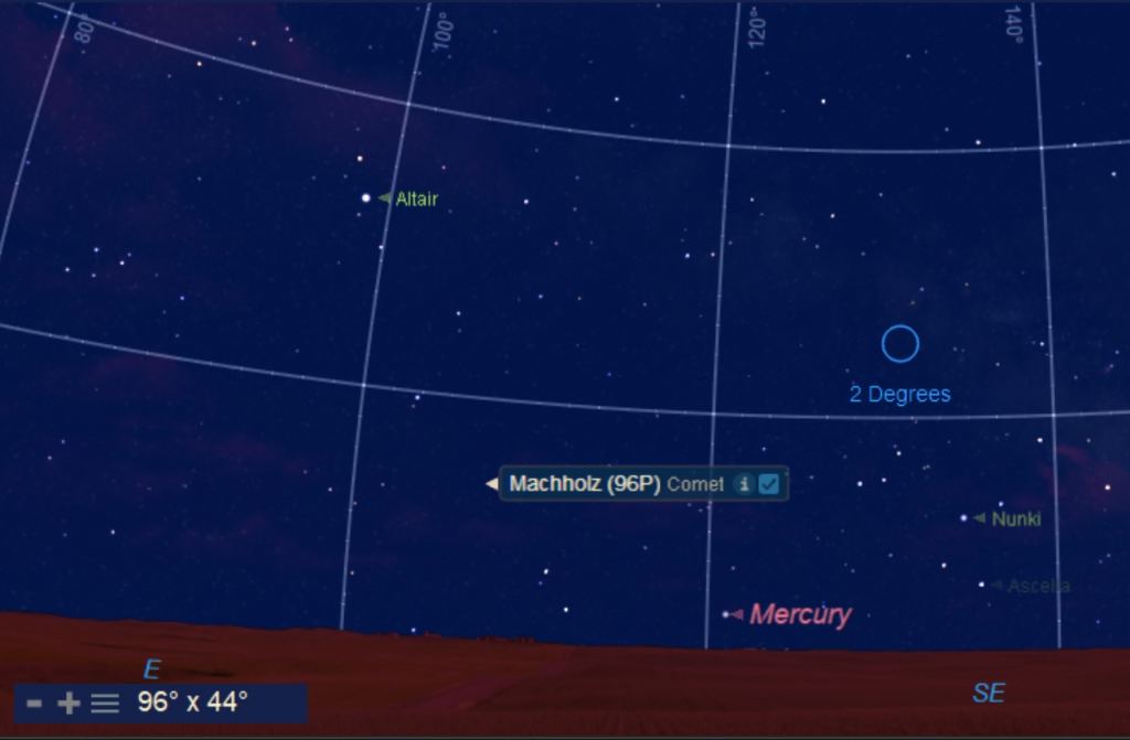 This week, the comet is hanging low to the east, higher than Mercury but lower than the bright star Altair, which both serve as good markers to find the comet. The comet is moving roughly away from us from our Earthly perspective, which means it will stay about 10 to 15 degrees above the eastern horizon for most of February 2023.