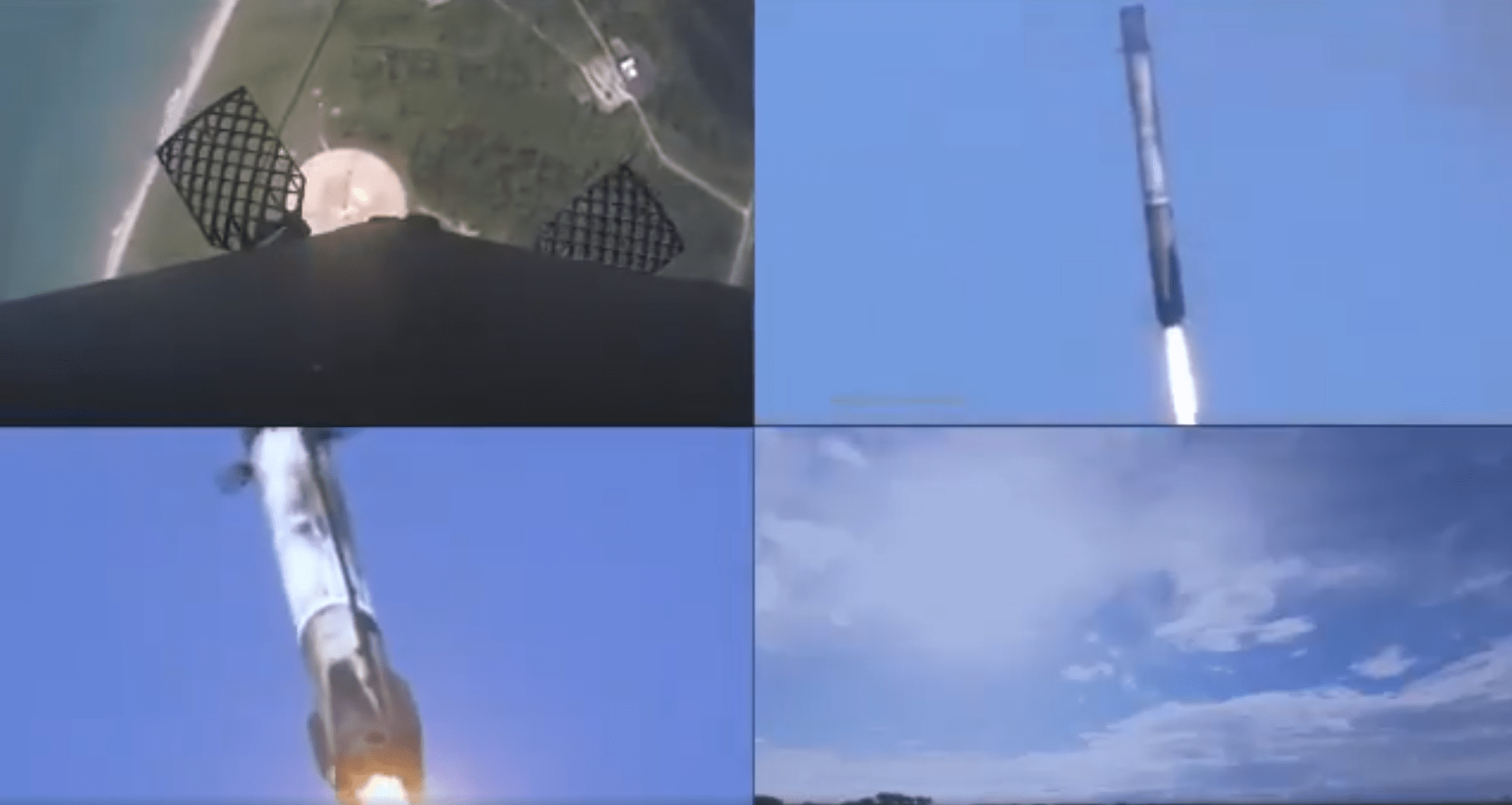 Elon Musk has posted a four-panel video of the Falcon re-entry on his Twitter feed and it's driving even jaded space-watchers into a frenzy.