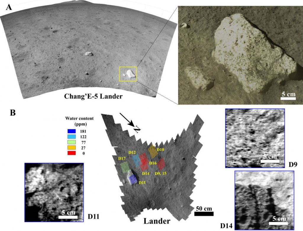 "The results of compositional and orbital remote sensing analyses show that the rock may have been excavated from an older basaltic unit and ejected to the landing site of Chang'e-5," said the team, in a press release from the Chinese Academy of Sciences. "Therefore, the lower water content of the soil, as compared to the higher water content of the rock fragment, suggests that degassing of the mantle reservoir beneath the Chang'E-5 landing site took place."