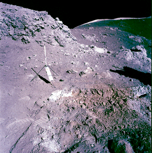 In the case of the Apollo 17 orange glass, analysis back on Earth revealed volcanic glass formed when molten lava from the interior of the Moon erupted, some 3 to 4 billion years ago, spewing up above the airless surface and into the vacuum of space. As the lava became exposed to the vacuum, it separated out into tiny fragments and froze, forming tiny beads of volcanic glass in orange and black colors. Later analysis revealed measurable water content in the beads.