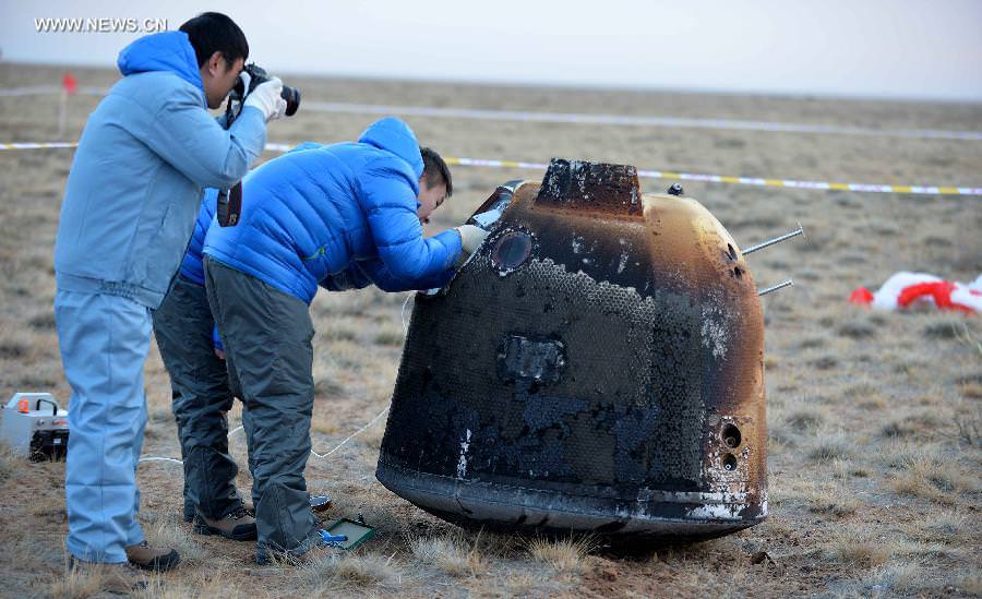 Researchers retrieve the return capsule of China's unmanned lunar orbiter in the central region of north China's Inner Mongolia Autonomous Region, Nov. 1, 2014. Return capsule of China's test lunar orbiter landed successfully early Saturday morning in north China's Inner Mongolia Autonomous Region, according to the Beijing Aerospace Control Center. Credit: Xinhua/Ren Junchuan[/caption]