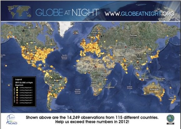 [caption id="attachment_92785" align="aligncenter" width="580" caption="Map of 2011 GLOBE at Night participation. Image Credit: GLOBE at Night / NOAO"]