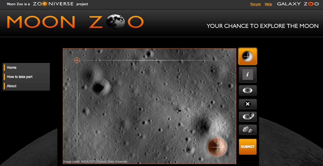 -- from the same folks that brought you Galaxy Zoo — is Moon Zoo. "We're asking citizen scientists to help answer different aspects of lunar science and outstanding questions that we still have," said Dr. Katherine Joy from the Lunar and Planetary Institute and a Moon Zoo science team member.