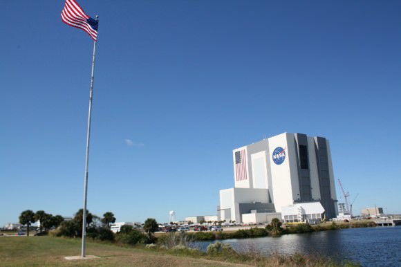 The path forward was cleared when the launch of an Atlas 5 rocket was scrubbed in its final stages in the early morning hours of November 14 and subsequently delayed until after the STS 129 launch. This avoided a potential conflict on the Air Force Eastern Range which requires a 48 hour turnaround to reconfigure tracking and support systems between launches. [caption id="attachment_45069" align="alignnone" width="580" caption="My view of the Vehicle Assembly Building (VAB) adjacent to the Kennedy Space Center Press Center. Shuttles are prepped for flight inside the rectangular box shaped buildings at left (near water tower) known as the Orbiter Processing Facility (OPF). At right see the Launch Control Center (LCC). Ares 1 rocket gantry under construction with tall crane to right of VAB. Credit: Ken Kremer "]