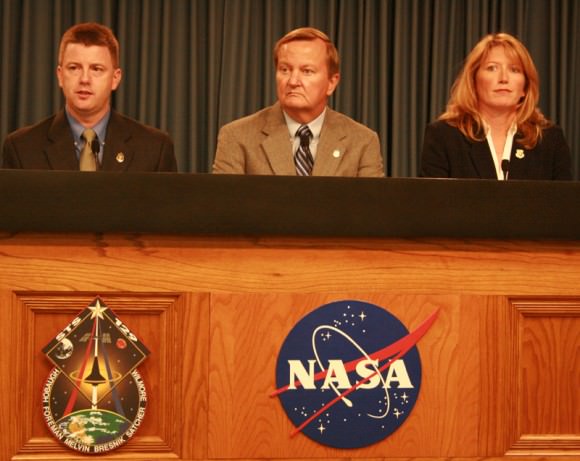 [caption id="attachment_45068" align="alignnone" width="580" caption="NASA managers unanimously declare Atlantis is "Go" for launch after reviewing all flight and hardware issues according to Mike Moses (left), director of Shuttle integration at a KSC press briefing. Shuttle Launch director Mike Leinbach (center) said "We are right on the money with the launch countdown. Cryogenics are being loaded into the shuttle fuel cells". Weather officer Kathy Winters (right) predicted a 90 percent chance of favorable weather at launch time on November 16. Credit: Ken Kremer "]
