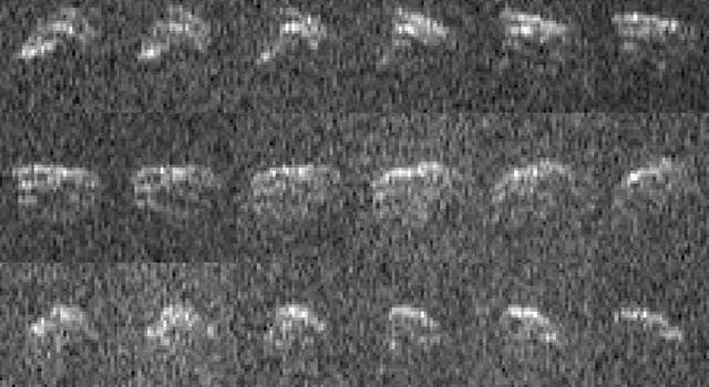 , astronomers pieced together 18 images of a rugged, irregular-shaped object about 130 feet (40 m) across. Radar measurements of an asteroid's distance and speed nail down its orbit with great accuracy, enabling scientists to predict whether or not it might become a danger to the planet at a future date.