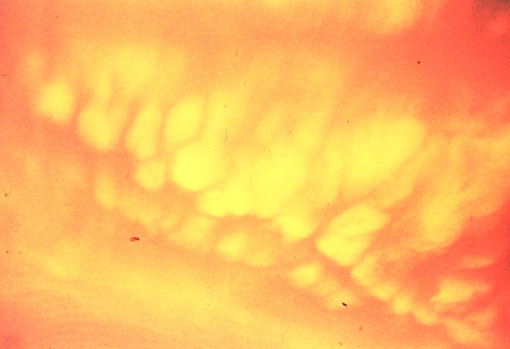 Here's a photo of mammatus clouds, taken by NASA. These are a type of cloud associated with thunderstorms and bad weather.