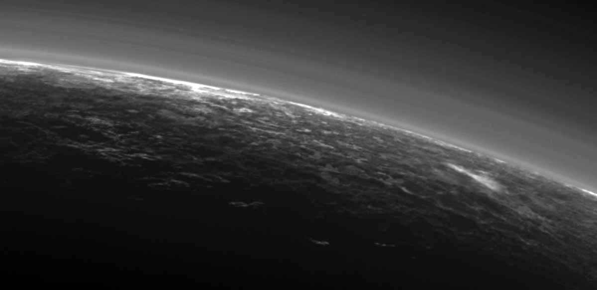 dark side and returned the first photos of a surprisingly complex, layered atmosphere. Colorless nitrogen along with a small percentage of methane make up Pluto's air. Layers of haze are likely created when the two gases react in sunlight to form tiny, soot-like particles called