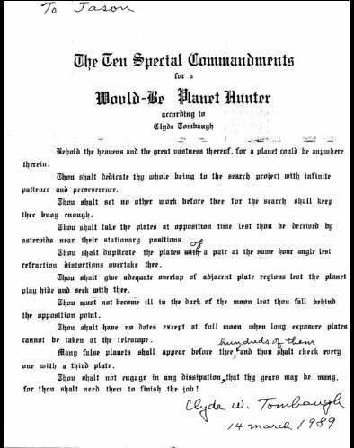 Back in 1989, amateur astronomer Toney Burkhart found out that Clyde Tombaugh was going to be giving a talk in San Francisco, just a short distance from Burkhart's home. Trouble was, he found out only about 10 minutes before the presentation was going to start, so he rushed over and arrived just in time to hear Tombaugh's talk, where he told amusing stories of how he found Pluto, and what he went through with night after night in a cold observatory taking photographs and comparing the glass plates, looking for a planet in the outer solar system. Then Tombaugh shared read his version of the Ten Commandments, called, "Ten Special Commandments for a Would-Be Planet Hunter."