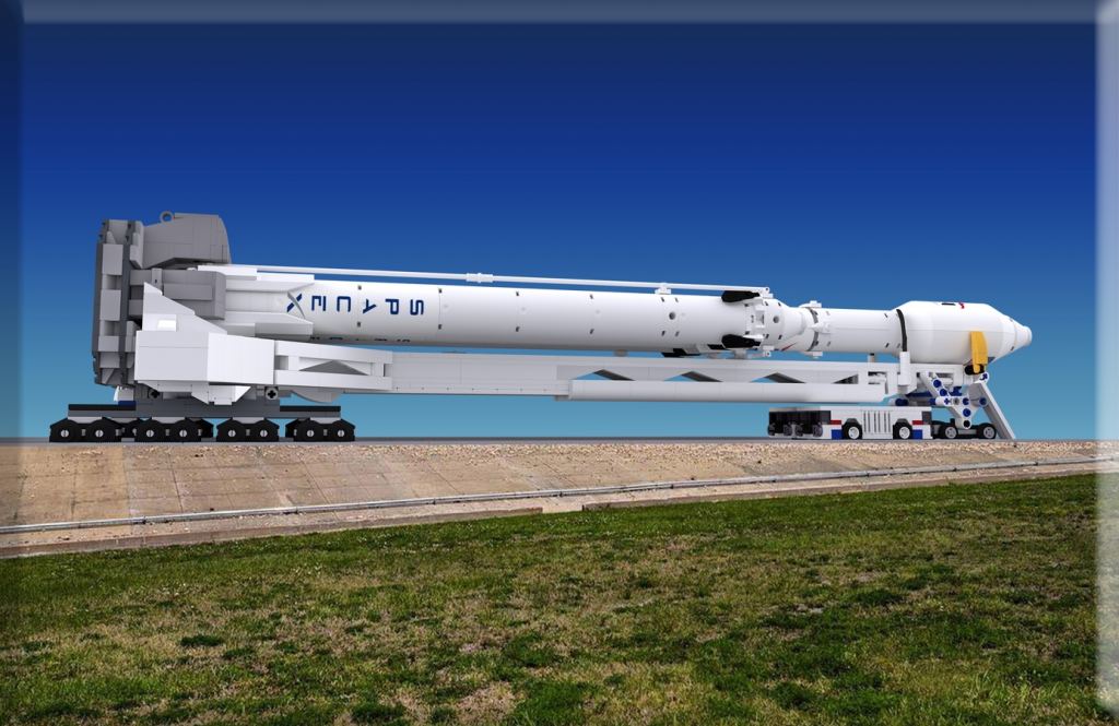 And last but not least, the set comes with a SpaceX Transporter/Erector/Launcher that can hold and display either the Falcon 9 or the Falcon Heavy. You can clamp in either rocket and then raise or lower it, ready for launch.