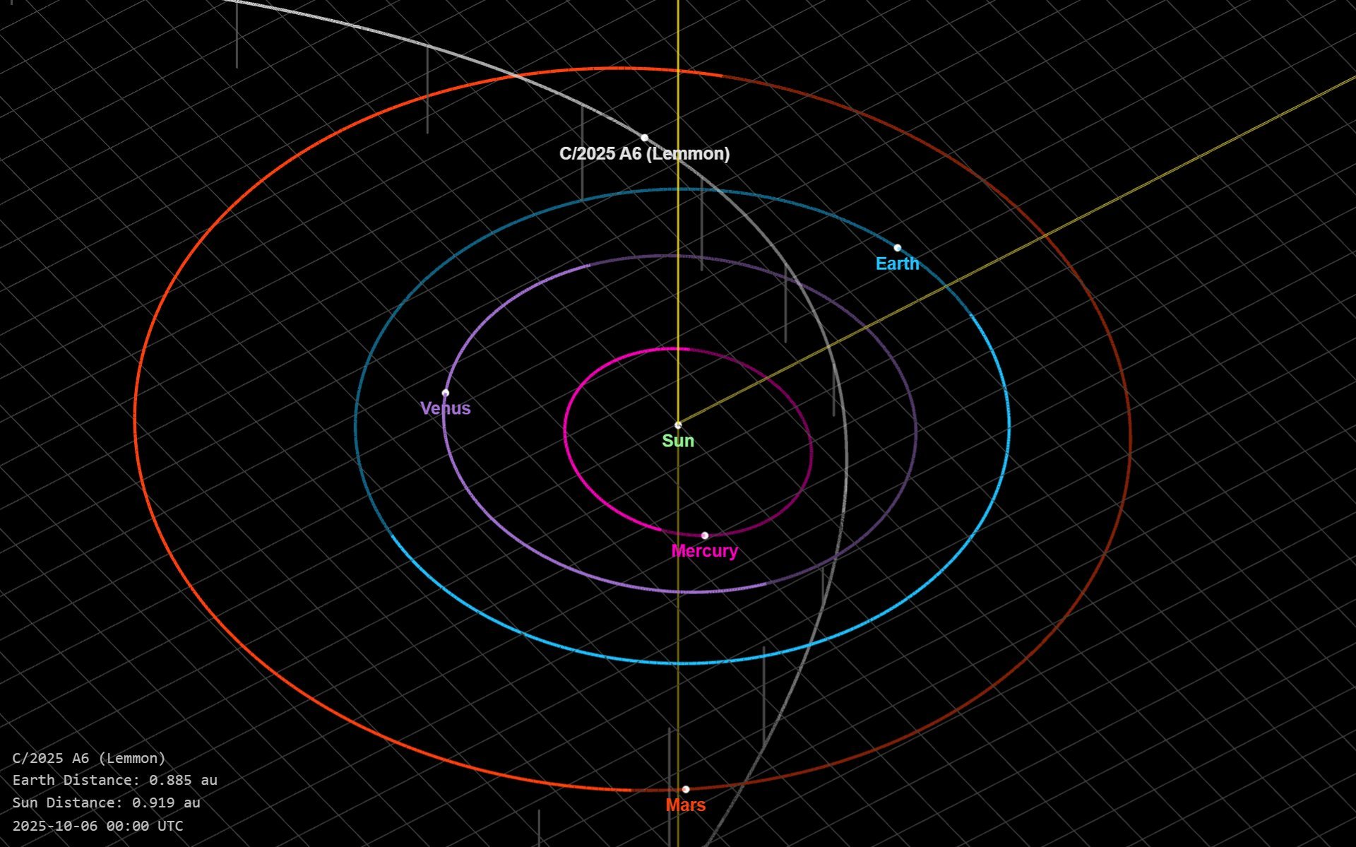 The orbital path of Comet A6 Lemmon through the inner solar system. Credit: NASA/JPL.