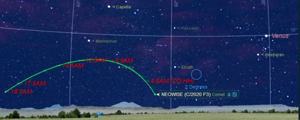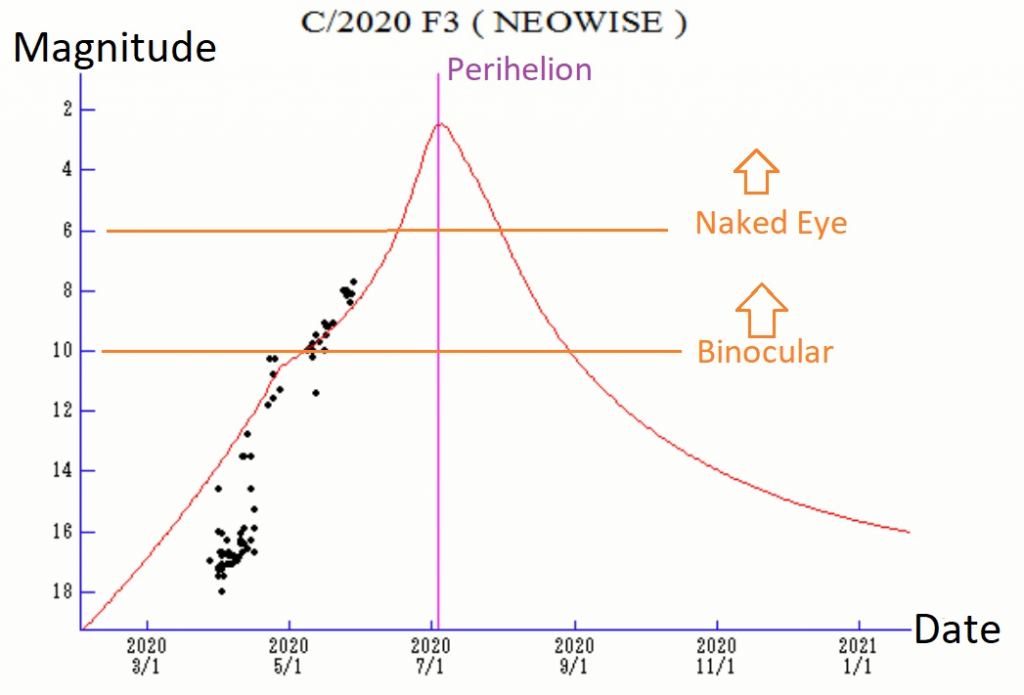 Update - Friday July 3* rd :* Comet C/2020 F3 NEOWISE reaches perihelion today at 16:18 UT/12:18 PM EDT. As of writing this, several observers worldwide have recovered the comet at dawn, and it seems to be holding steady at magnitude +0.5. The dawn apparition is, however, a tough catch, as the comet stays very low to the northeast at dawn in early July. We've added in a finder chart (below) for this brief dawn apparition; things improve greatly towards mid-July, as the comet shifts over to the dusk sky and heads out away from the Sun. Let's hope it stays bright, and maybe throws an outburst our way! We'll continue to post updates on Twitter as @Astroguyz as the celestial situation warrants.