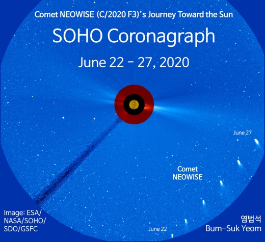 The comet brightened dramatically as it transited through the field of view of the joint NASA/ESA Solar and Heliospheric Observatory's (SOHO) LASCO C3 camera in late June, reaching magnitude +0.5 as of June 30th. The LASCO passage occurred from June 23 to June 28th, reaching an apparent 7 degrees from the disk of the Sun on June 27th. This comes as SOHO celebrates its 4,000th comet discovery.