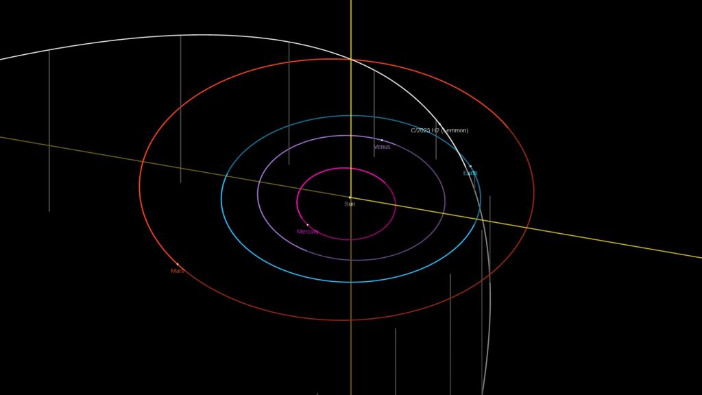 Comet H2 Lemmon reached perihelion 0.9 Astronomical Units (AU) from the Sun just inside the Earth's orbit on October 29th. The MOID (Minimum Orbit Intersection Distance) from Earth for the comet is just 0.036 AU (5.4 million kilometers), and the comet is on a long 3,870 year, retrograde orbit, inclined 114 degrees relative to the ecliptic plane.