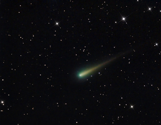 This nice image comes from Chris Schur from Arizona, taken on October 14, and is also of the conjunction. "As you may recall, on this date of 10/14 the three objects were in a perfect line going from south to north in Leo," Chris said via email. "What a spectacular sight in the 11 x 80 binoculars! While the comet was quite faint, a short 1/4 degree of tail could be seen, and the gorgeous blue and orange colors of the planets."