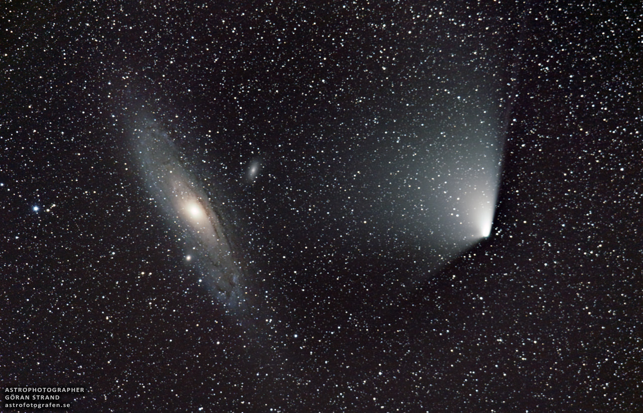 More of our readers had success in capturing the awesomeness of seeing Comet PANSTARRS encounter the Andromeda Galaxy (M31) in the night sky. Göran Strand sent us this absolutely gorgeous image, taken from 70 km north of Östersund, Sweden -- a really dark site with no light pollution. "This photo is a 30 minute exposure through my 300mm/f2.8 lens using my full format Nikon D3s camera," Göran said. "Besides seeing the comet and the galaxy, I also got to see 4 elks, 2 meteors, 1 bolide and 1 aurora. So all in all, it was a good night!"
