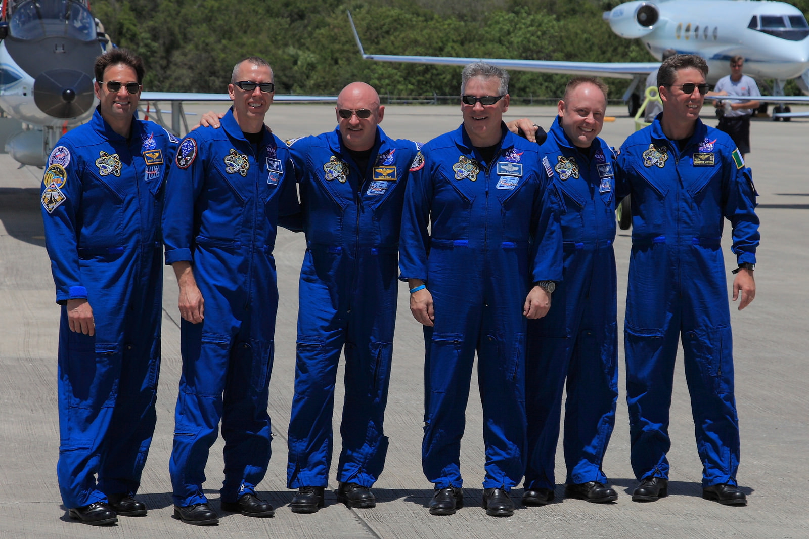 [caption id="attachment_85172" align="aligncenter" width="580" caption="STS 134 crew pose for photographers at Shuttle Landing Facility on April 26. Launch is set for April 29. Mission Specialists Greg Chamitoff, Andrew Feustel, Commander Mark Kelly, Pilot Greg H. Johnson, Mission Specialist Mike Fincke and European Space Agency astronaut Roberto Vittori. Credit: Ken Kremer"]