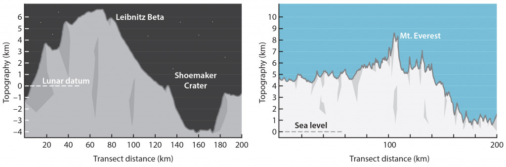 Scientists with the Lunar South Pole Atlas have created two new images of those mountains that show their elevation compared to Earth's tallest mountain, Mt. Everest. The two images are of Malapert Massif and Leibniz Beta.