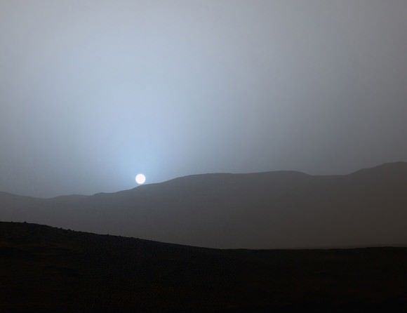 This was the first sunset observed in color by Curiosity on Mars. Credit: NASA/JPL-Caltech/MSSS/Texas A&M Univ.[/caption]