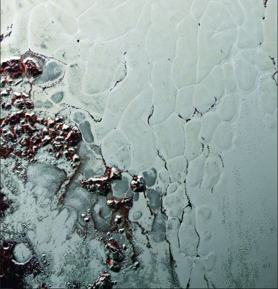 Like a cosmic lava lamp, a large section of Pluto's icy surface in Sputnik Planum is being constantly renewed by a process called convection that replaces older surface ices with fresher material. Credit: NASA/Johns Hopkins University Applied Physics Laboratory/Southwest Research Institute.[/caption]