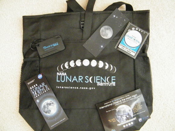 I attended the NASA Lunar Science Institute's Annual Lunar Forum last week, and the wonderful people from NLSI provided a very cool bag of goodies -- including a great backpack/bag with the NLSI logo, a bookmark, luggage nametag, lanyard (including an official PRESS badge!), stickers and other informational handouts. We're giving this prize package away to one of our readers! Just send an email to