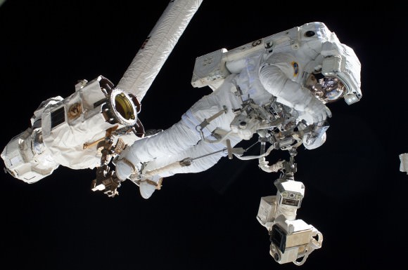 Expedition 15's Clay Anderson (on Canadarm2) and STS-118's Rick Mastracchio (right) during an August 2007 maintenance spacewalk on the International Space Station. The NASA astronauts relocated an S-Band antenna subassembly, installed a new transponder and retrieved another transponder. Credit: NASA[/caption]
