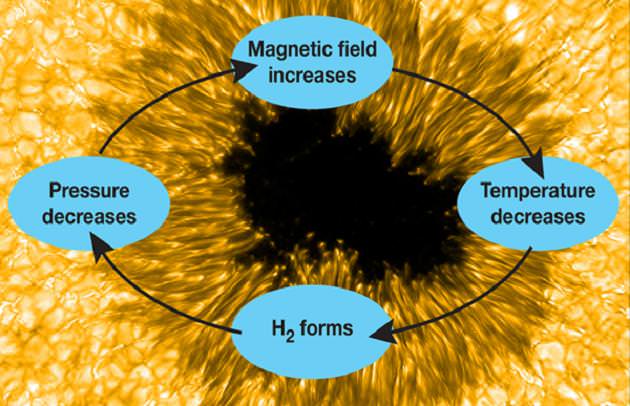 By combining both old and new data, the team measured magnetic fields across sunspots, and the OH intensity inside spots, judging the H2 concentrations. "We found evidence that significant quantities of hydrogen molecules form in sunspots that are able to maintain magnetic fields stronger than 2,500 Gauss," Jaeggli commented. She also said its presence leads to a temporary "runaway" intensification of the magnetic field.