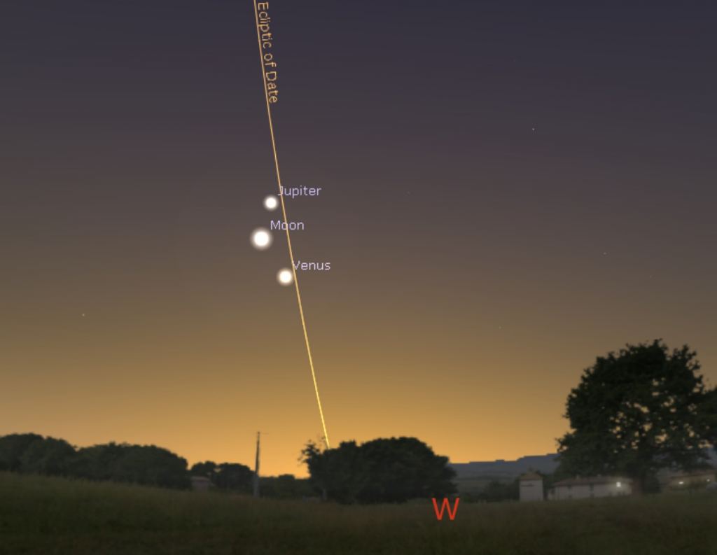 The celestial action is already afoot, as the slim waxing crescent Moon pays the closing pair a visit on the night of Wednesday February 22nd. The Moon will actually occult (pass in front of) Jupiter for the southern tip of South America on Wednesday evening: the rest of us will see a close pass.