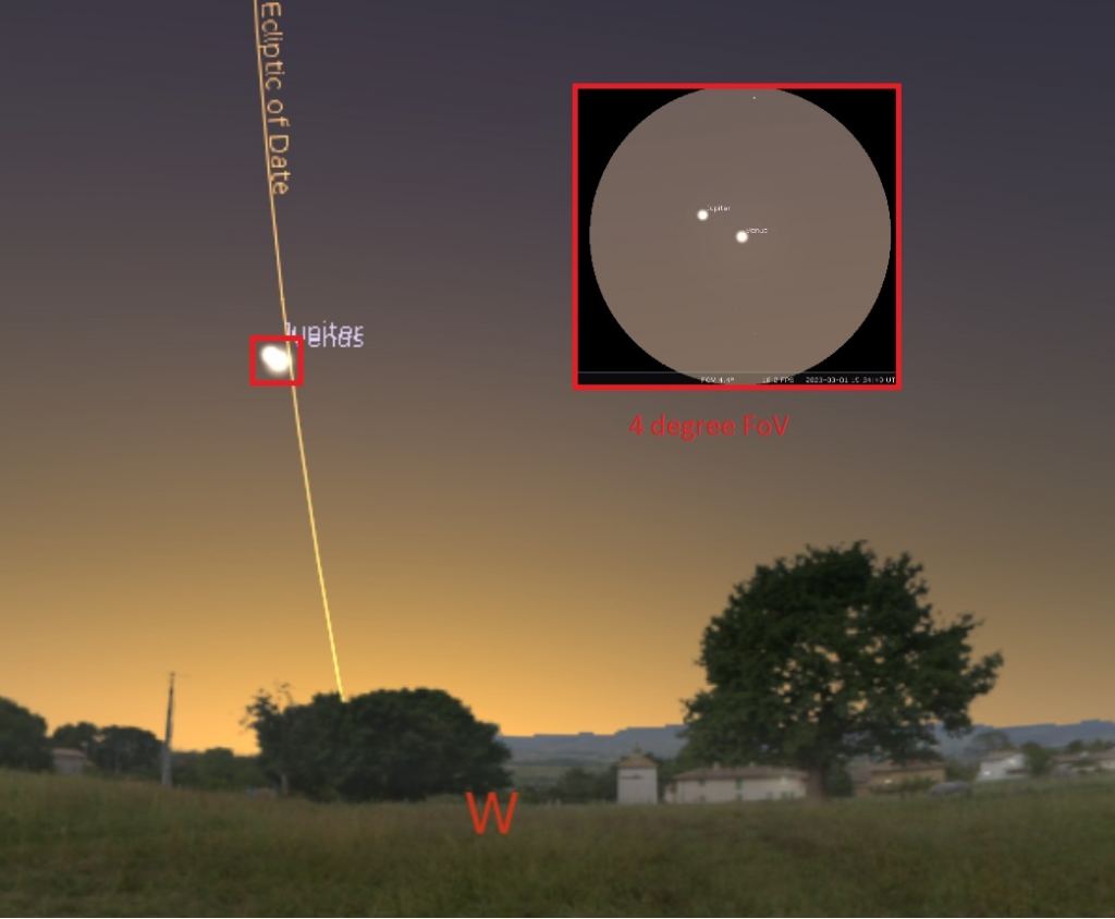 The March 1stconjunction is the closest for Venus and Jupiter since April 30th, 2022. The two planets won't be closer until May 23rd, 2024. Venus and Jupiter are 31 degrees east of the Sun at closest approach on next week, placed well in the dusk.