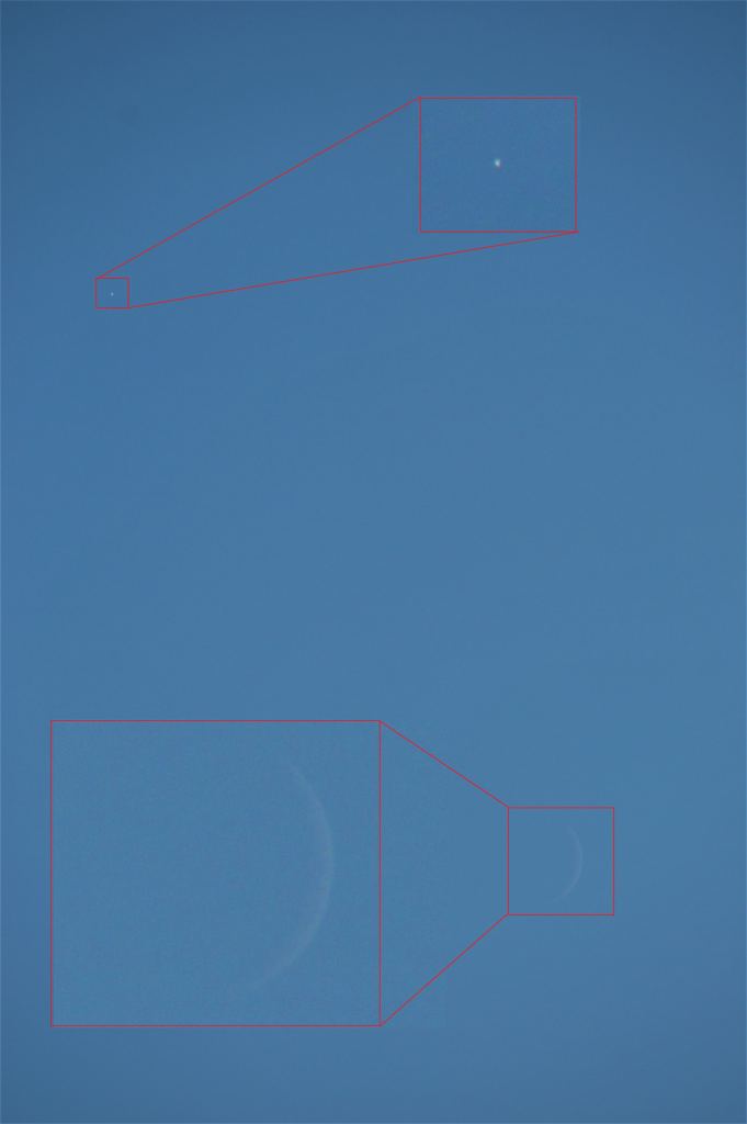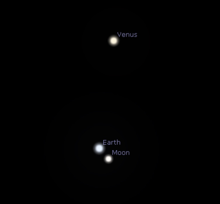 Now, for the wow! factor of what you're seeing: Venus is an apparent disk 12" across and 86% illuminated during the pass, while Jupiter is 34" across. Of course, gas giant Jupiter is much larger than Venus… but it's also over four times farther away, at 5.77 Astronomical Units (AU) or over 537 million miles (1.18 billion kilometers) distant. Looking back from Jupiter, you'd see Earth and Venus in a close 25' embrace, with the +4.6 magnitude Moon thrown in.