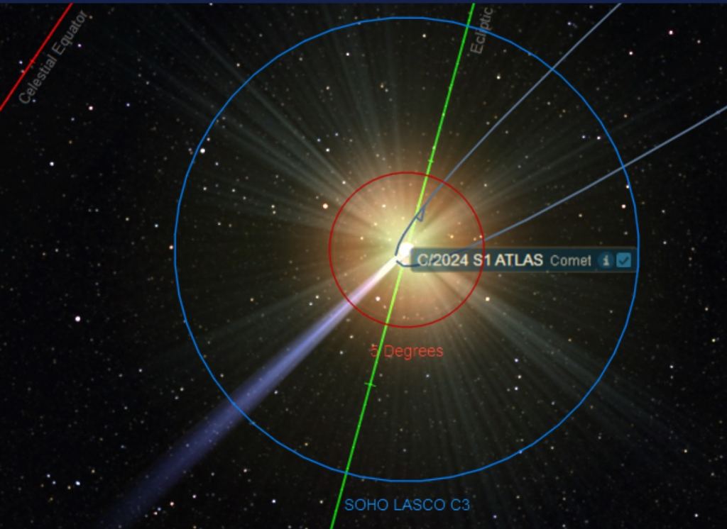 The comet enters the Solar Heliospheric Observatory (SOHO's) LASCO C2/C3 field of view on October 26th, and exits on the 29th. It's strange to think: prior to SOHO's launch in 1995, astronomers knew of less than a handful of sungrazer comets. Now, thanks to the mission, we know of 5,065 sungrazing comets and counting.