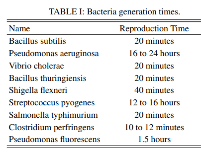 The authors used E. Coli generation times under optimal conditions in their work. In aerobic and nutrient-rich conditions, E. Coli can reproduce in 20 minutes. So, the E. Coli population will double three times in one hour. Bacteria must reproduce faster than they fall to the surface to sustain itself. They need to form a colony.
