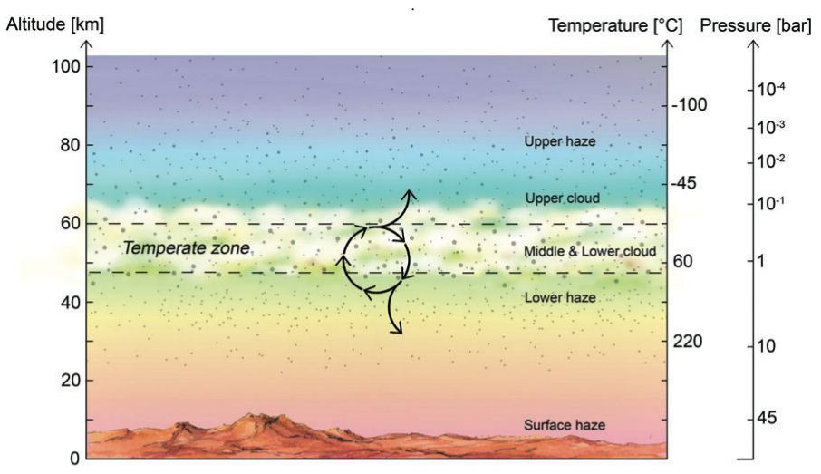 56.5 to 70 km altitude, the middle layer from 50.5 to 56.5 km, and the lower layer from 47.5 to 50.5 km. The smallest droplets can float in all three layers. But the largest droplets, which the authors call type 3 droplets with a radius of 4 µm, are only present in the middle and lower layers.