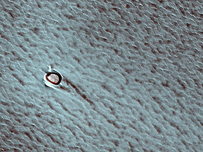 [/caption] With all the different spacecraft orbiting and roving on the Red Planet, we're finding that Mars is a wonderfully diverse and dynamic planet, with some unusual landforms. Take craters, for instance, and especially a few images of craters from the Mars Reconnaissance Orbiter's HiRISE camera. The image above shows a small impact crater on the bright north polar ice cap, near where the Phoenix lander sits, now silently. The perennial, or permanent, portion of the north polar cap consists almost entirely of water ice, and so this curious-looking crater in the ice has never melted away. And its obvious how differently craters are formed in ice; ice ejecta just doesn't look the same as soil! This crater is about 66 meters (215 feet) in diameter, and scientists think the slightly elliptical shape of the crater is a result of an oblique, or a sideways impact (instead of straight down.) And if you think this crater is unusual, how about a crater that looks upside down....