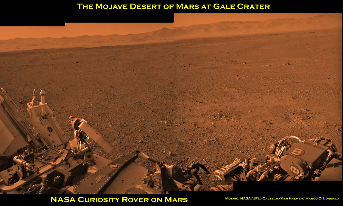 Image Caption: Curiosity and the Mojave Desert of Mars at Gale Crater North Rim. This false color panoramic mosaic shows Curiosity in the foreground looking to the eroded rim of Gale Crater in the background. Visible at left is a portion of the RTG nuclear power source, low gain antenna pointing up, then the deployed High Gain antenna and other components of the rover deck. This mosaic was assembled from the three new full resolution Navcam images returned by Curiosity overnight. Processing by Ken Kremer and Marco Di Lorenzo. Topsoil at right foreground has been excavated by the descent landing thrusters to expose what the team believes is bedrock. Credit: NASA/JPL-Caltech/ Ken Kremer /Marco Di Lorenzo