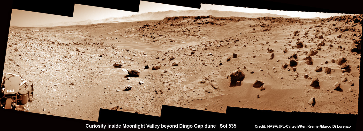 Curiosity scans Moonlight Valley beyond Dingo Gap Dune. Curiosity's view to "Moonlight Valley" beyond after crossing over 'Dingo Gap' sand dune. This photomosaic was taken after Curiosity drove over the 1 meter tall Dingo Gap sand dune and shows dramatic scenery in the valley beyond, back dropped by eroded rim of Gale Crater. Assembled from navigation camera (navcam) raw images from Sol 535 (Feb. 6, 2104) Credit: NASA/JPL-Caltech/Ken Kremer- kenkremer.com/Marco Di Lorenzo See below more before/after Dingo Gap imagery Story updated[/caption]