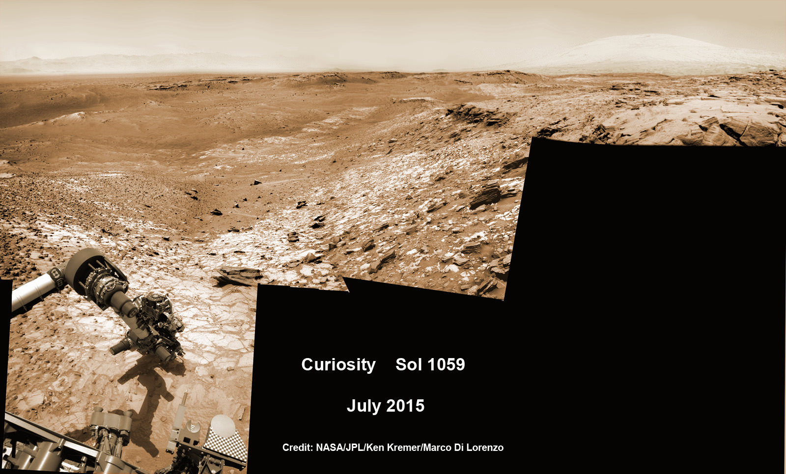 Curiosity extends robotic arm and conducts test drill at "Buckskin" rock target at bright toned "Lion" outcrop on the lower region of Mount Sharp on Mars, seen at right. Gale crater rim seen in the distant background at left, in this composite mosaic of navcam raw images taken to Sol 1059, July 30, 2015. Navcam camera raw images stitched. Credit: NASA/JPL-Caltech/Ken Kremer/kenkremer.com/Marco Di Lorenzo [/caption]