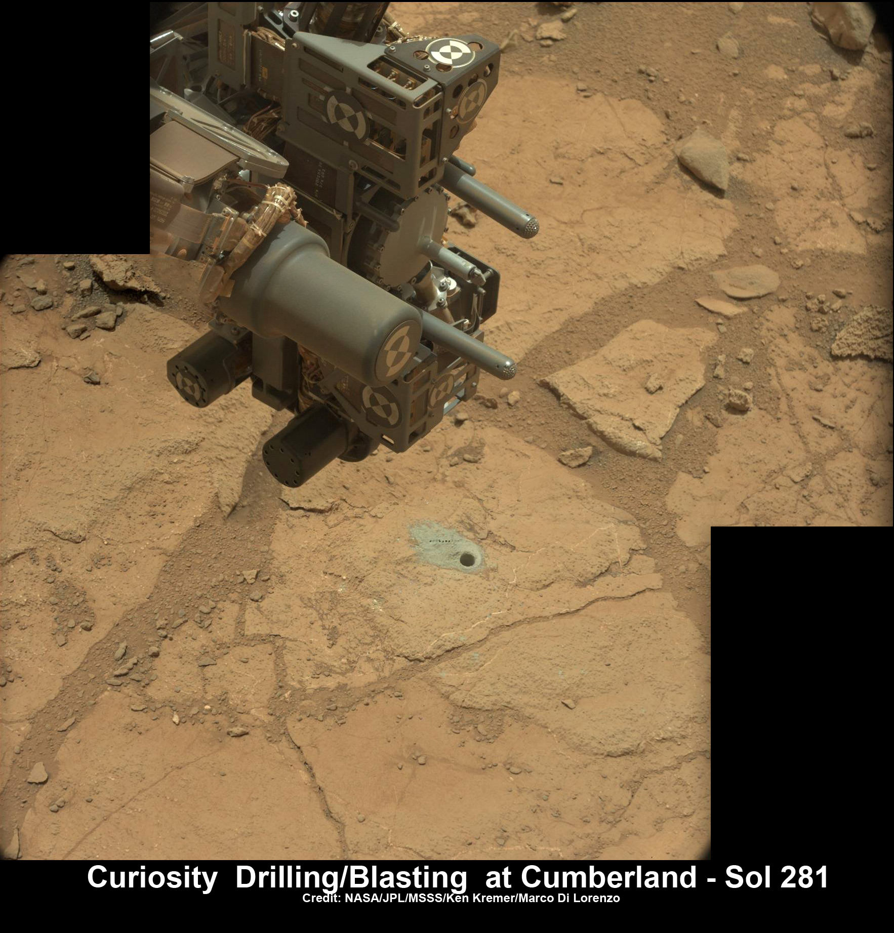 This time lapse mosaic shows Curiosity moving her robotic arm to drill into her 2nd rockt target named "Cumberland" to collect powdery material on May 19, 2013 (Sol 279) for analysis by her onboard chemistry labs; SAM & Chemin. The photomosaic was stitched from raw images captured by the navcam cameras on May 14 & May 19 (Sols 274 & 279). Credit: NASA/JPL-Caltech/Ken Kremer/Marco Di Lorenzo [/caption]
