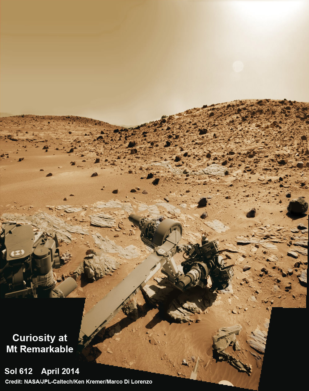Curiosity's Panoramic view of Mount Remarkable at 'The Kimberley Waypoint' where rover will conduct 3rd drilling campaign inside Gale Crater on Mars. The navcam raw images were taken on Sol 603, April 17, 2014, stitched and colorized. Credit: NASA/JPL-Caltech/Ken Kremer - kenkremer.com/Marco Di Lorenzo [/caption]